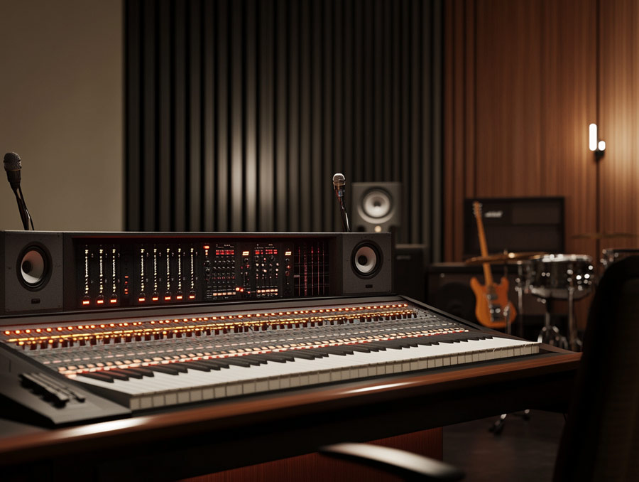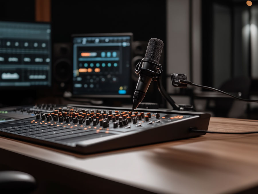 Un studio modulable dédié à la création audio : production musicale, enregistrement (chant, instruments, voix-off, podcasts), mix & mastering, captation et montage.